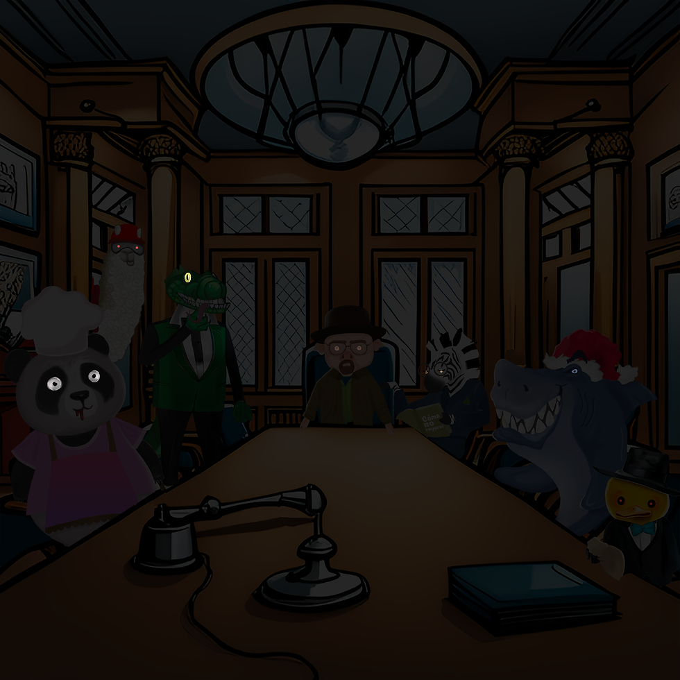 Todos los invitados han llegado a la mansión, asombrados por tantas figuras, estos recorren los pasillos lentamente, hasta que alcanzan la sala principal y se reúnen para la lectura del testamento, el notario agarra los papeles y se dispone a leer ante tantos impacientes.